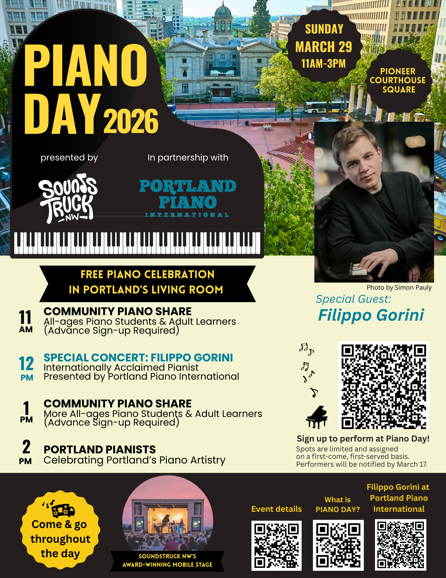 Piano Day 2026 is a free, all-ages public celebration honoring the piano as both a concert instrument and a shared community instrument. Taking place in the heart of downtown Portland, the four-hour event brings together students, adult learners, professional pianists, and the general public for an inclusive day of music-making and listening. The program features Community Piano Share performances, a special featured concert by internationally acclaimed pianist Filippo Gorini, and a closing spotlight on Portland’s piano community.